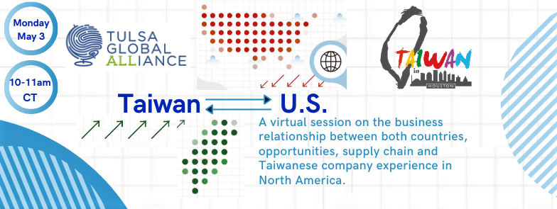 On May 3, Tulsa Global Alliance hosted a virtual program focused on doing business with Taiwan, bringing together trade officials, economic development leaders, and business executives from Taiwan and North America. The session explored U.S.-Taiwan business relationships, supply chain considerations, and the experiences of Taiwanese companies operating in North America. The event was presented by Tulsa Global Alliance in partnership with the Tulsa–Kaohsiung Sister City Partnership and organized by TGA Vice Chair of International Business Jazi Hiriart.