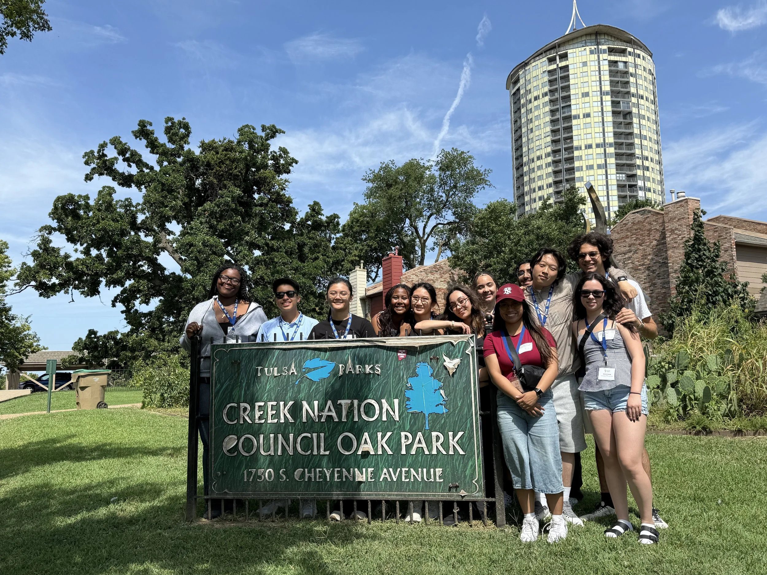 The group stayed with host families, and TGA is grateful to all the Tulsa area hosts who opened their homes to our Canadian guests. TGA arranged a schedule of meetings and activities to introduce the students to civic engagement in Tulsa, including meetings with Take 2 Café, author Clifton Taulbert, Deputy Mayor Krystal Reyes, members of the Cherokee Nation Youth Council, and Williams. The group volunteered alongside Tulsans at Catholic Charities of Eastern Oklahoma and the Food Bank of Eastern Oklahoma, and enjoyed cultural activities such as visiting Greenwood Rising, bowling at Andy B’s, a tour of the downtown tunnels, and watching Jurassic World: Rebirth at the AMC 20.